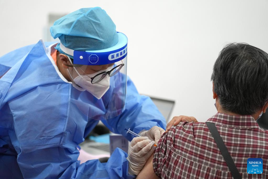 A medical worker injects a booster shot of COVID-19 vaccine for an 89-year-old citizen at Aoyuncun Subdistrict in Chaoyang District, Beijing, capital of China, July 13, 2022. Inoculation of the COVID-19 vaccine for the elderly has steadily advanced in Beijing. (Xinhua/Ju Huanzong)