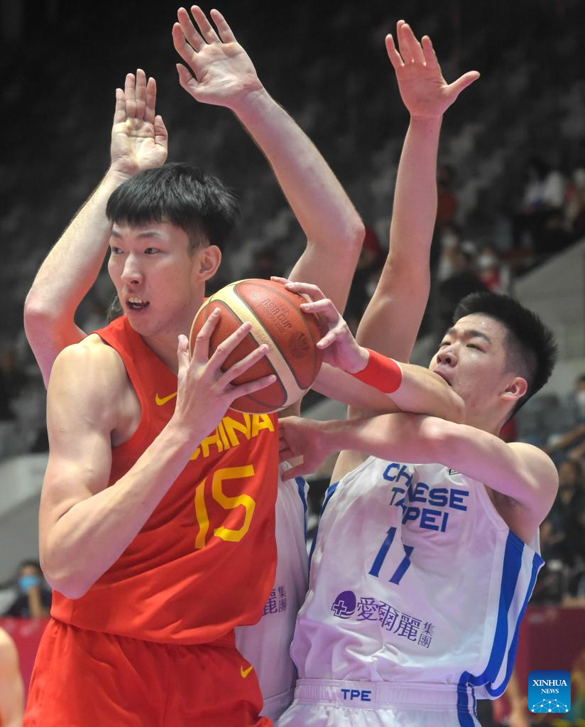 Zhai Xiaochuan (L) of China competes during a Group B match between Chinese Taipei and China of the FIBA Asia Cup 2022 in Jakarta, Indonesia, July 16, 2022. (Xinhua/Zulkarnain)