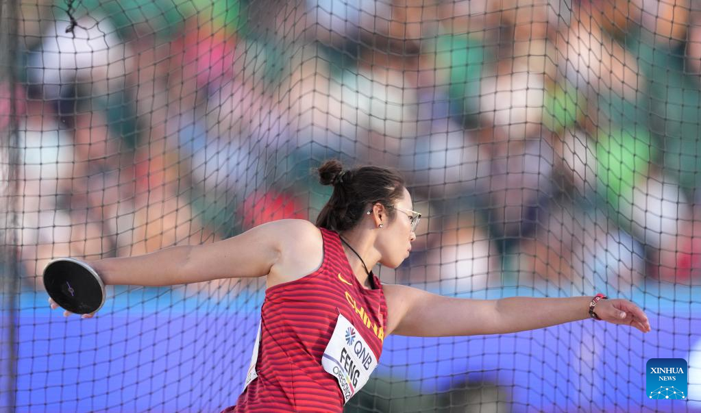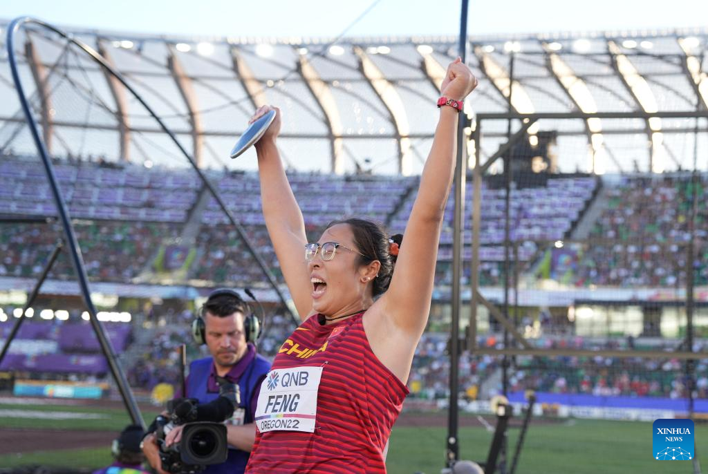 The final witnessed Feng, 28, burst onto the scene. Feng, whose previous best result was fifth place at 2019 Doha worlds, locked the victory with 69.12 meters in her first attempt as three of her six valid throws bettered or was close to her personal best of 66.00m.