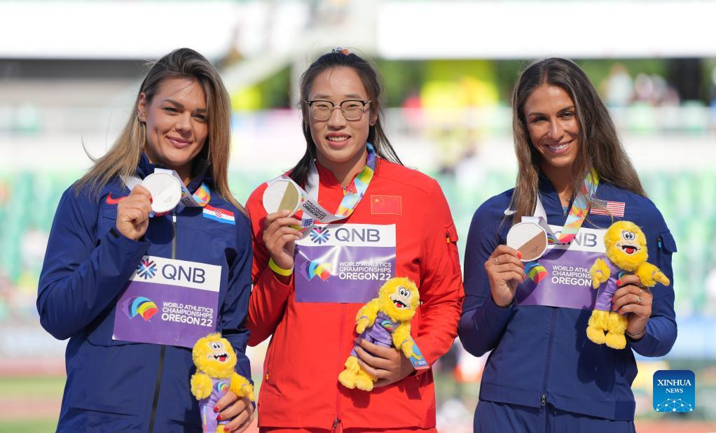 Gold medalist Feng Bin (C) of China, silver medalist Sandra Perkovic (L) of Croatia and bronze medalist Valarie Allman of the United States pose for photos during the awarding ceremony of women's discus throw at the World Athletics Championships Oregon22 in Eugene, Oregon, the United States, July 21, 2022. (Xinhua/Wu Xiaoling)