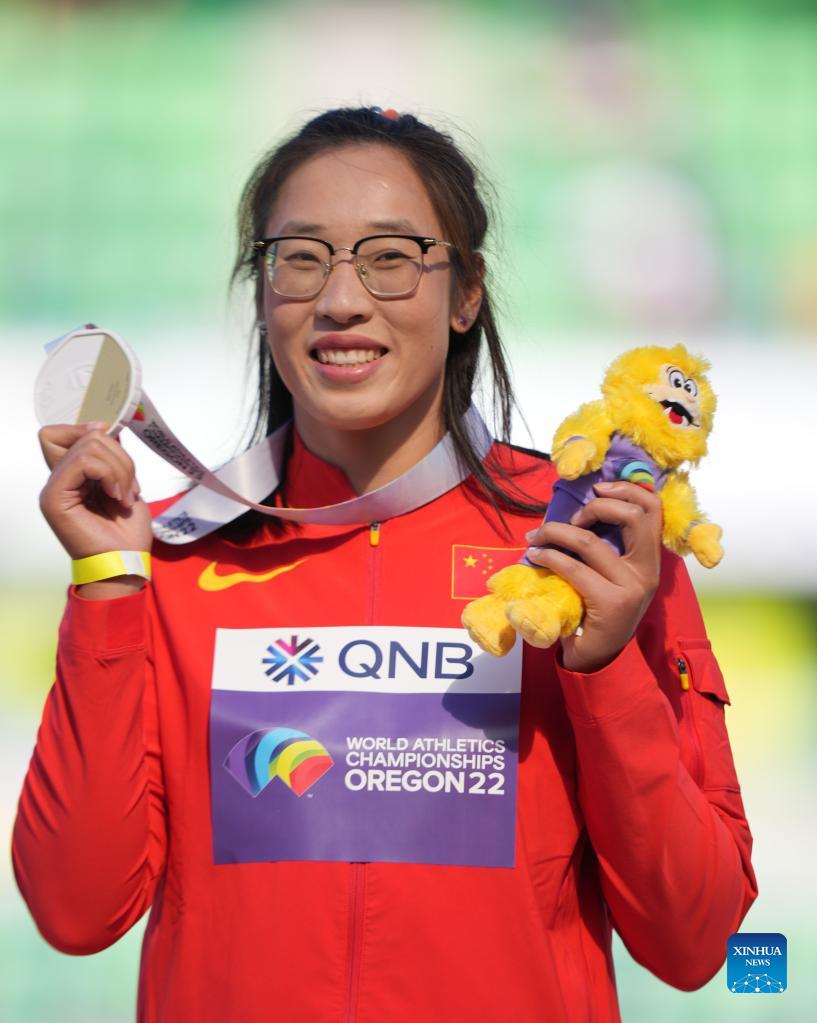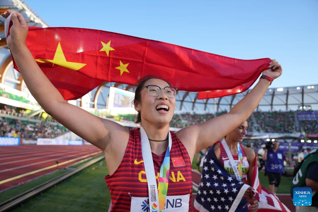 Gold medalist Feng Bin of China poses for photos during the awarding ceremony of women's discus throw at the World Athletics Championships Oregon22 in Eugene, Oregon, the United States, July 21, 2022. (Xinhua/Wu Xiaoling)