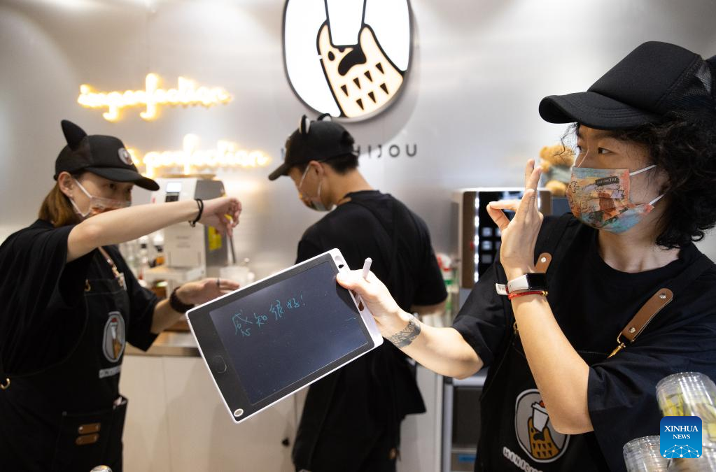 A hearing-impaired barista (R) communicates with Yin Tianbao's colleague (L) by a tablet about Yin's progress at a coffee-making training center in east China's Shanghai, June 29, 2022. Visually impaired twin brothers Yin Tianbao and Yin Tianyou learned coffee making skills with the help of their family and friends, and started a coffee shop in east China's Shanghai. Their shop is now under a trial operation. Xinhua reporter have had a month-long tracking interview with the brothers to record their steps before the shop's trial operation. (Xinhua/Jin Liwang)