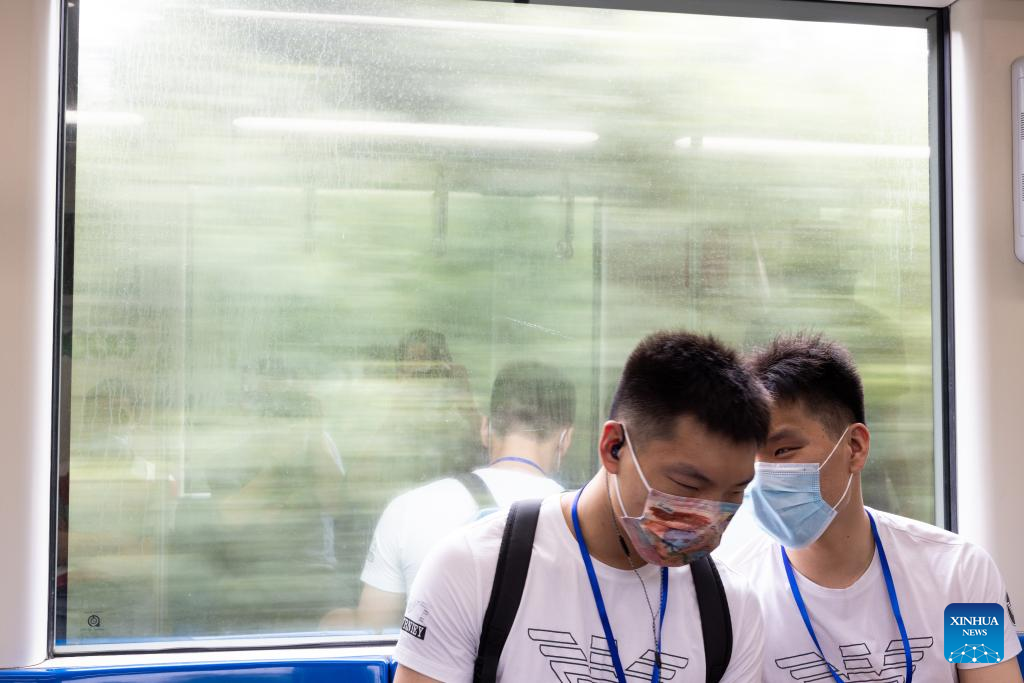 Yin Tianbao (L) and Yin Tianyou chat on the subway in east China's Shanghai, July 19, 2022. Visually impaired twin brothers Yin Tianbao and Yin Tianyou learned coffee making skills with the help of their family and friends, and started a coffee shop in east China's Shanghai. Their shop is now under a trial operation. Xinhua reporter have had a month-long tracking interview with the brothers to record their steps before the shop's trial operation. (Xinhua/Jin Liwang)