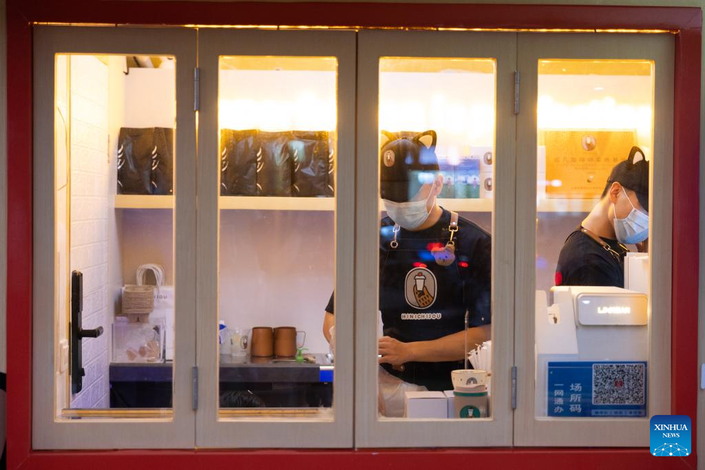 Aerial photo taken on July 16, 2022 shows customers waiting to buy coffee at the coffee shop run by Yin Tianbao and Yin Tianyou in east China's Shanghai. Visually impaired twin brothers Yin Tianbao and Yin Tianyou learned coffee making skills with the help of their family and friends, and started a coffee shop in east China's Shanghai. Their shop is now under a trial operation. Xinhua reporter have had a month-long tracking interview with the brothers to record their steps before the shop's trial operation. (Xinhua/Jin Liwang)
