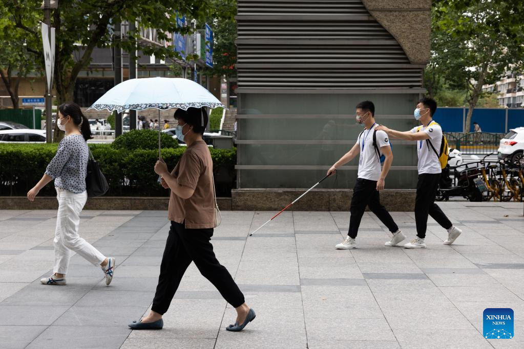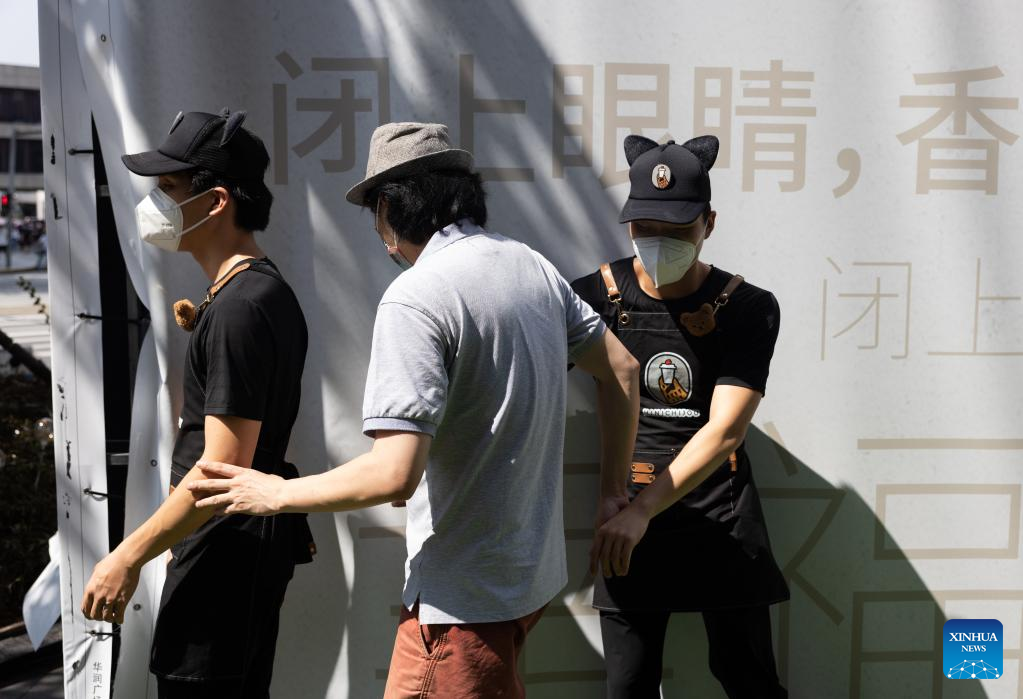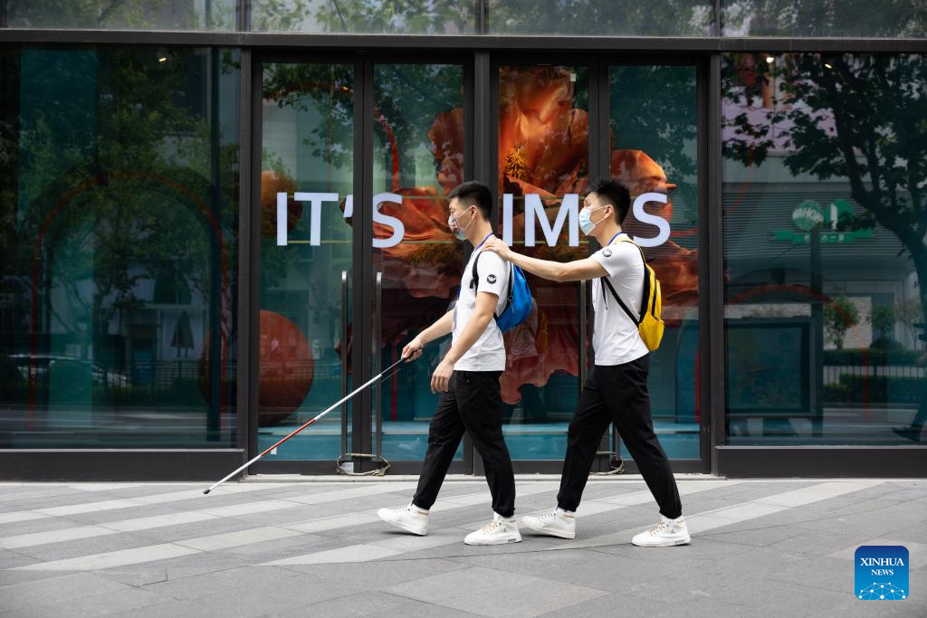 Tiantian (C), a friend of Yin Tianbao (R) and Yin Tianyou, guides them to their coffee shop for their trial operation in east China's Shanghai, July 10, 2022. Visually impaired twin brothers Yin Tianbao and Yin Tianyou learned coffee making skills with the help of their family and friends, and started a coffee shop in east China's Shanghai. Their shop is now under a trial operation. Xinhua reporter have had a month-long tracking interview with the brothers to record their steps before the shop's trial operation. (Xinhua/Jin Liwang)