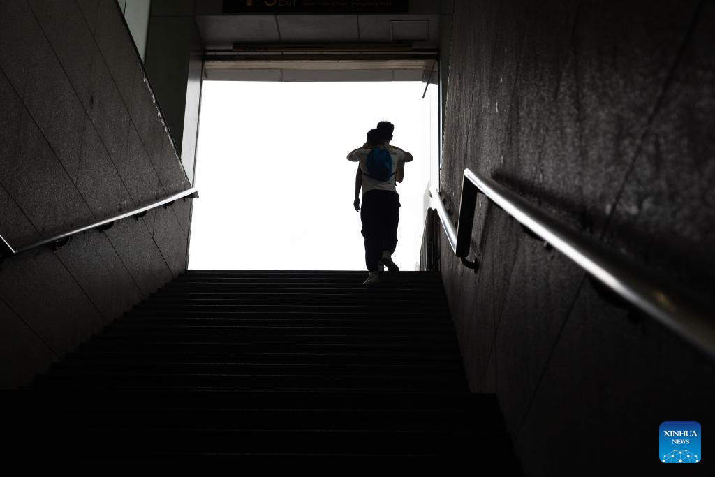 Yin Tianbao (front) and Yin Tianyou climb the stairs at a subway station on their way to their coffee shop in east China's Shanghai, July 19, 2022. Visually impaired twin brothers Yin Tianbao and Yin Tianyou learned coffee making skills with the help of their family and friends, and started a coffee shop in east China's Shanghai. Their shop is now under a trial operation. Xinhua reporter have had a month-long tracking interview with the brothers to record their steps before the shop's trial operation. (Xinhua/Jin Liwang)