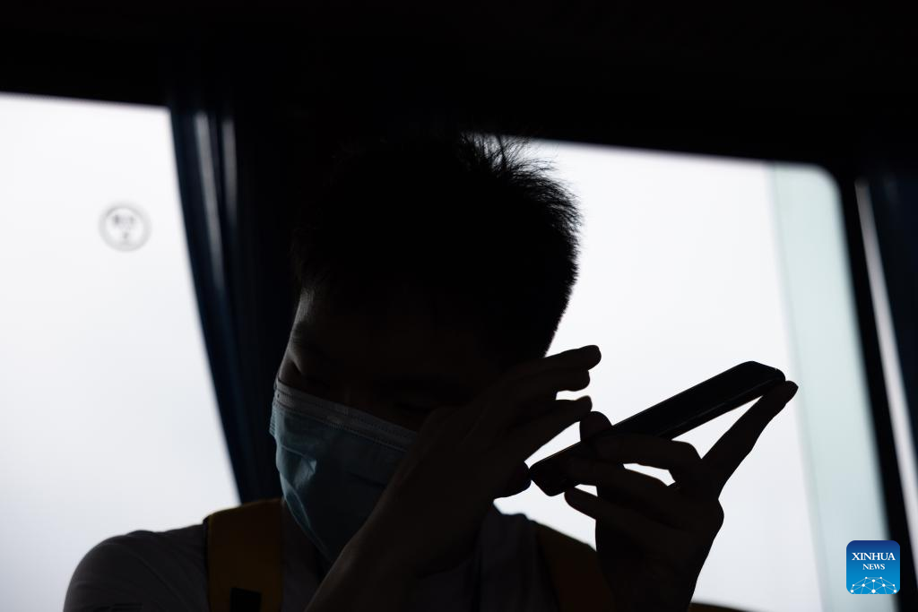 Yin Tianyou receives Wechat messages on the subway in east China's Shanghai, July 19, 2022. Visually impaired twin brothers Yin Tianbao and Yin Tianyou learned coffee making skills with the help of their family and friends, and started a coffee shop in east China's Shanghai. Their shop is now under a trial operation. Xinhua reporter have had a month-long tracking interview with the brothers to record their steps before the shop's trial operation. (Xinhua/Jin Liwang)