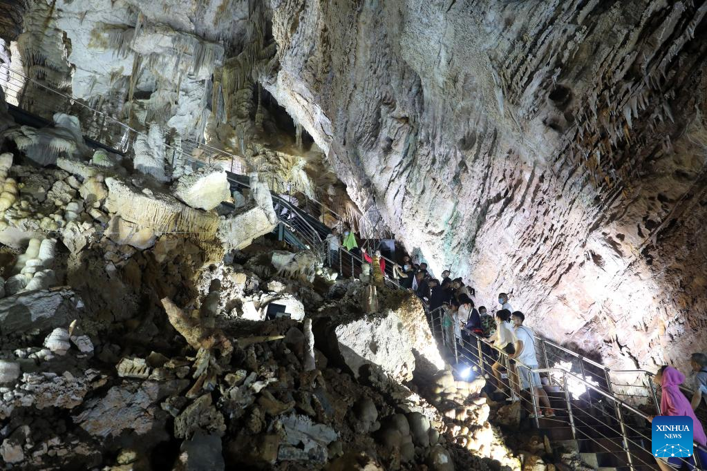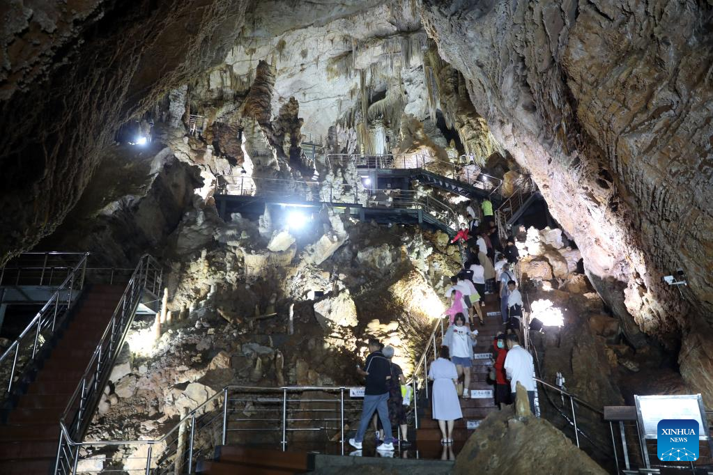 Tourists visit the Xinglong karst cave in Xinglong County, north China's Hebei Province, Aug. 3, 2022. (Xinhua/Luo Xuefeng)