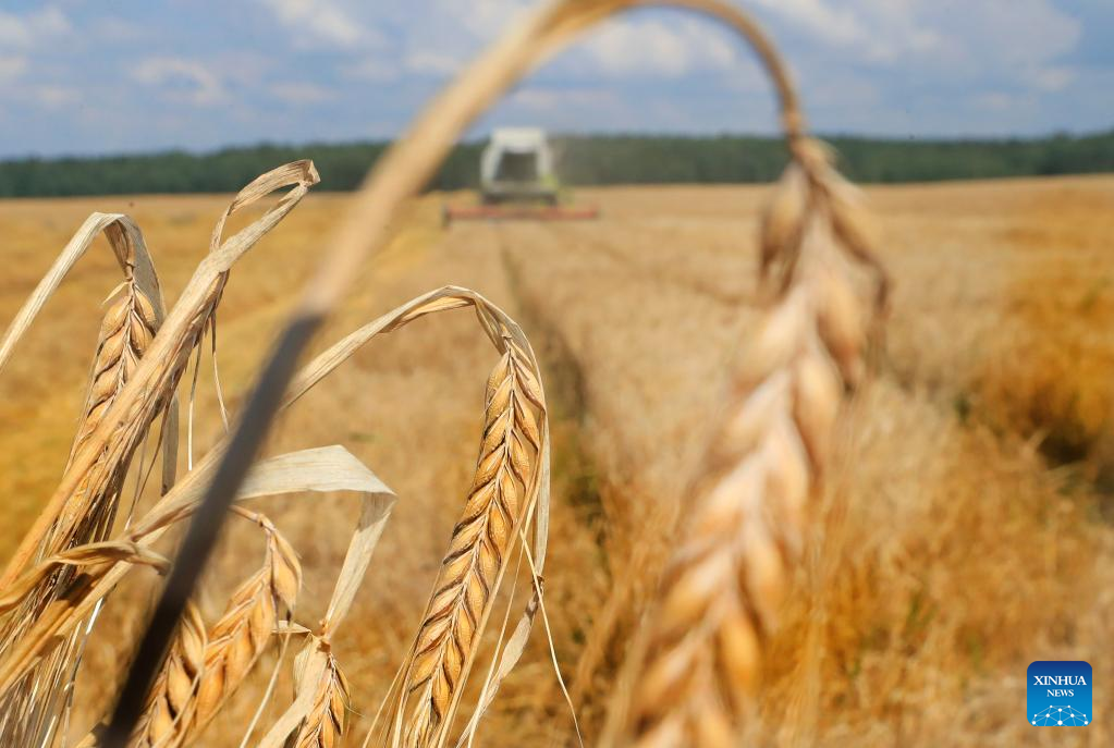 A reaper harvests grains in Minsk, Belarus, Aug. 4, 2022. (Photo by Henadz Zhinkov/Xinhua)