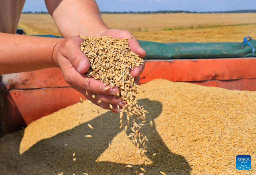 Photo taken on Aug. 4, 2022 shows grains just been harvested in Minsk, Belarus. (Photo by Henadz Zhinkov/Xinhua)