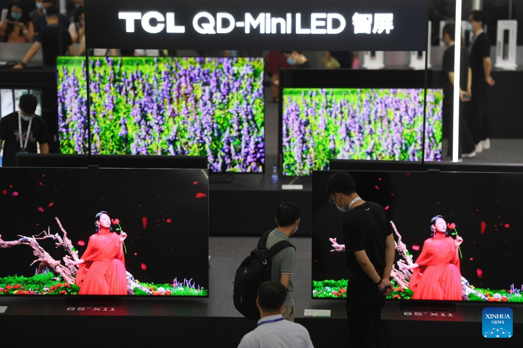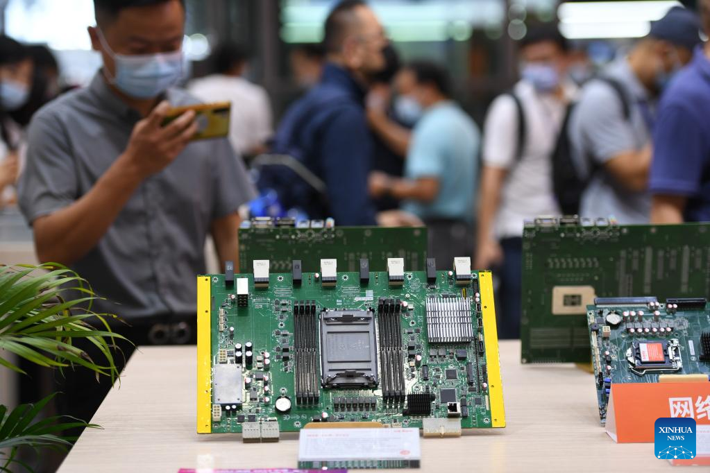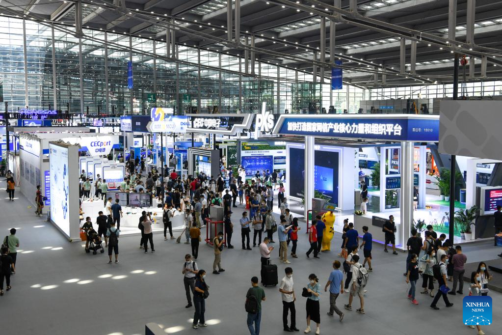 Visitors watch exhibits at the 10th China Information Technology Expo in Shenzhen, south China's Guangdong Province, Aug. 16, 2022. With an exhibition area of around 100,000 square meters, the 10th China Information Technology Expo kicked off in Shenzhen on Tuesday, attracting the participation of over 1,400 enterprises. (Xinhua/Mao Siqian)