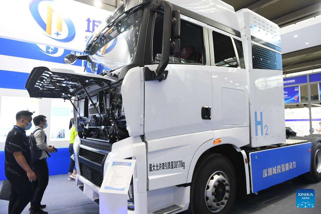 Visitors watch a hydrogen-powered heavy truck at the 10th China Information Technology Expo in Shenzhen, south China's Guangdong Province, Aug. 16, 2022. With an exhibition area of around 100,000 square meters, the 10th China Information Technology Expo kicked off in Shenzhen on Tuesday, attracting the participation of over 1,400 enterprises. (Xinhua/Mao Siqian)