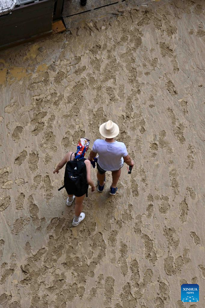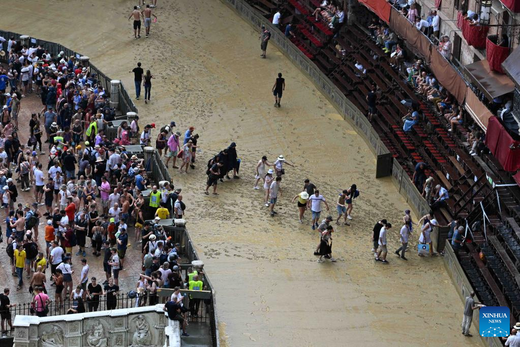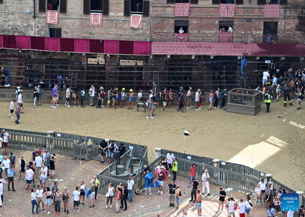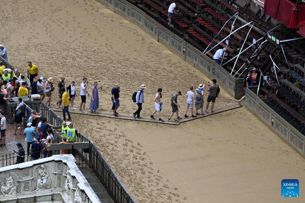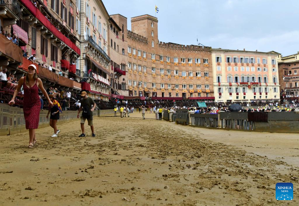 Spectators leave after the suspension of the horse race Palio in Siena, Italy, Aug. 16, 2022. The horse race Palio has been postponed to Aug. 17 due to the rain. The historical horse race Palio is held again this year after a two-year pause because of the COVID-19 pandemic. (Xinhua/Jin Mamengni)