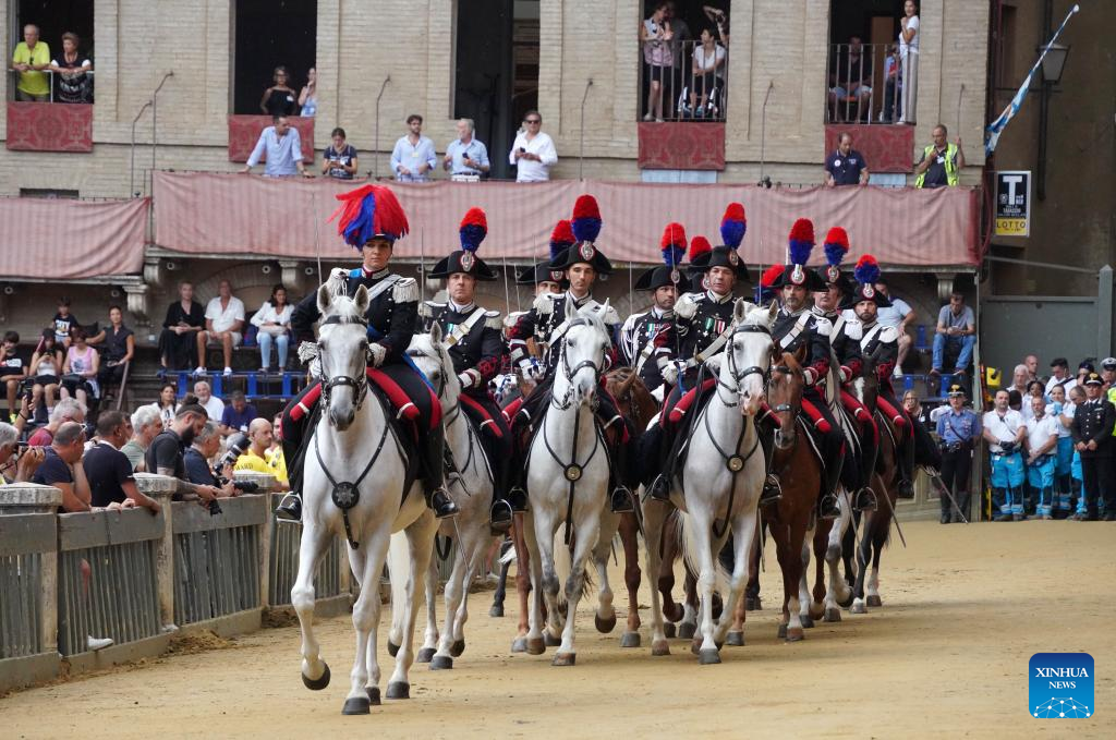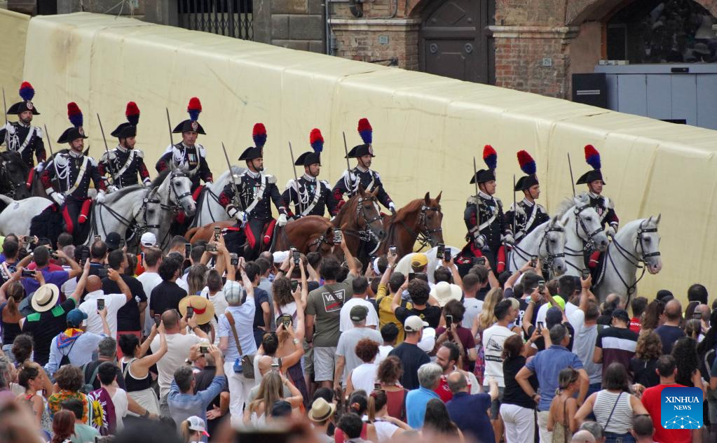 Italian Carabinieri perform before the suspension of the horse race Palio in Siena, Italy, Aug. 16, 2022. The horse race Palio has been postponed to Aug. 17 due to the rain. The historical horse race Palio is held again this year after a two-year pause because of the COVID-19 pandemic. (Xinhua/Jin Mamengni)