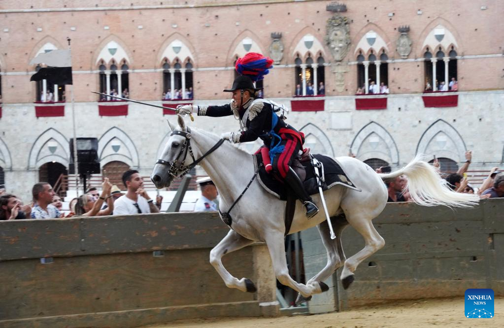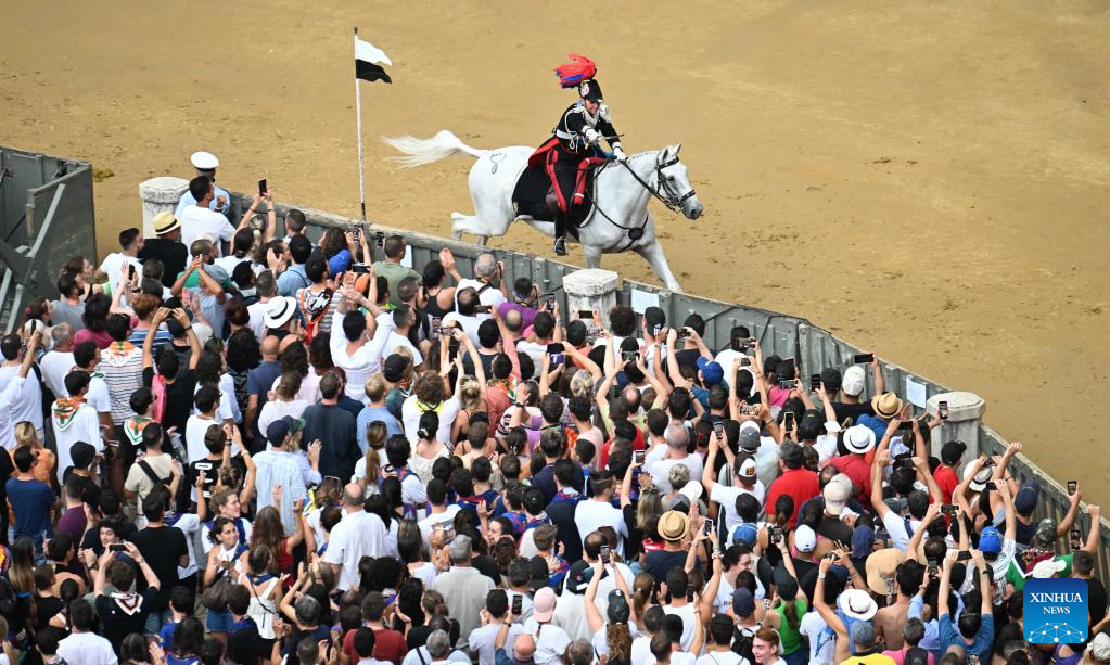 An Italian Carabinieri performs before the suspension of the horse race Palio in Siena, Italy, Aug. 16, 2022. The horse race Palio has been postponed to Aug. 17 due to the rain. The historical horse race Palio is held again this year after a two-year pause because of the COVID-19 pandemic. (Xinhua/Jin Mamengni)