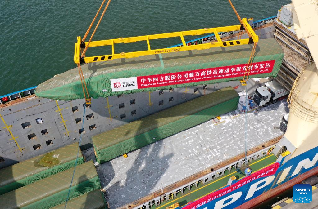 Photo taken on Aug. 18, 2022 shows a high-speed electric passenger train, customized for the Jakarta-Bandung high-speed railway, being loaded on a vessel in Qingdao Port of east China's Shandong province. A set of passenger trains and a inspection train will be transported to Indonesia, marking important progress in the construction of the railway, a landmark project under the Belt and Road Initiative. (Photo by Jiang Chao/Xinhua)