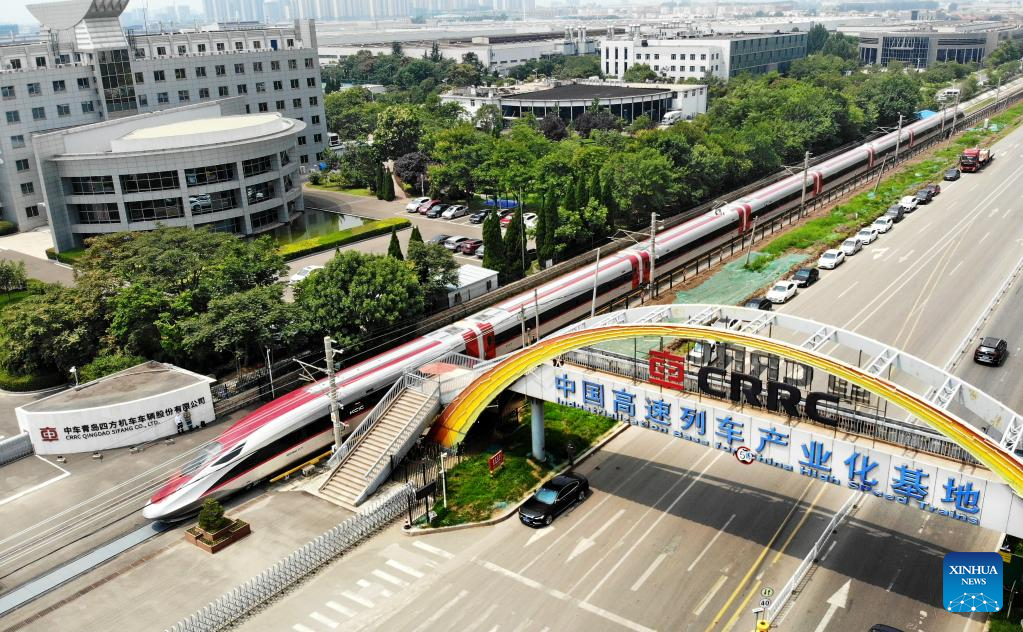 Aerial photo taken on Aug. 5, 2022 shows a set of high-speed passenger train, customized for the Jakarta-Bandung high-speed railway, during a trial run in Qingdao, east China's Shandong province. A set of passenger trains and a inspection train will be transported to Indonesia, marking important progress in the construction of the railway, a landmark project under the Belt and Road Initiative. (Xinhua/Li Ziheng)
