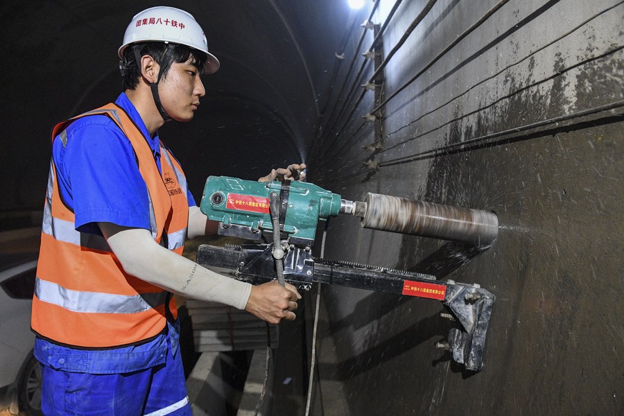A worker operates at Jiuwandashan No.4 tunnel along the Guiyang-Nanning high-speed railway in Huanjiang Maonan Autonomous County, south China's Guangxi Zhuang Autonomous Region, Aug. 16, 2022. (Xinhua/Cao Yiming)