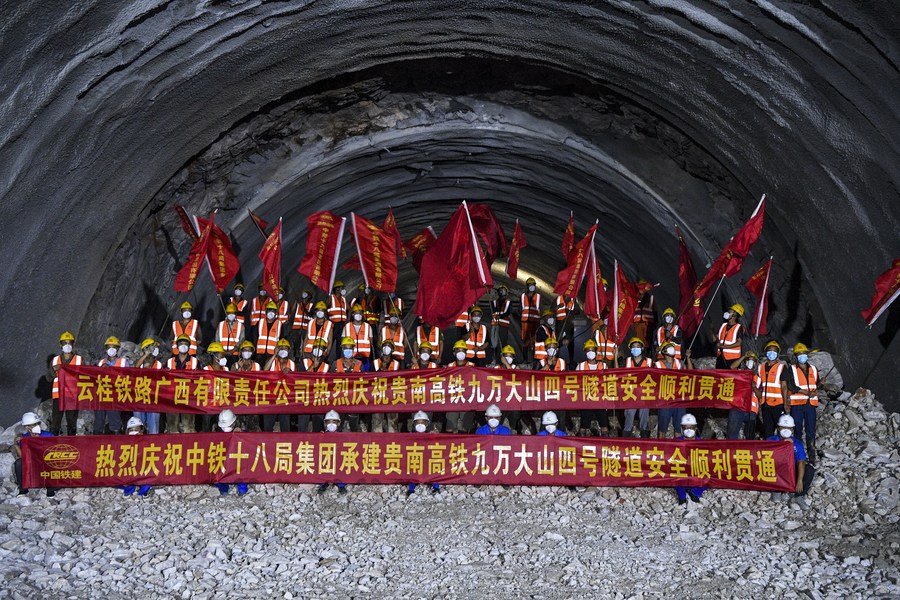 Workers celebrate at Jiuwandashan No.4 tunnel along the Guiyang-Nanning high-speed railway in Huanjiang Maonan Autonomous County, south China's Guangxi Zhuang Autonomous Region, Aug. 17, 2022. (Xinhua/Cao Yiming)