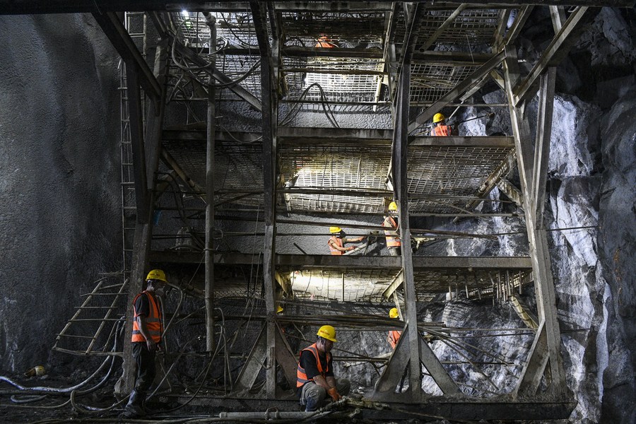 Workers are seen at Jiuwandashan No.4 tunnel along the Guiyang-Nanning high-speed railway in Huanjiang Maonan Autonomous County, south China's Guangxi Zhuang Autonomous Region, Aug. 16, 2022. (Xinhua/Cao Yiming)