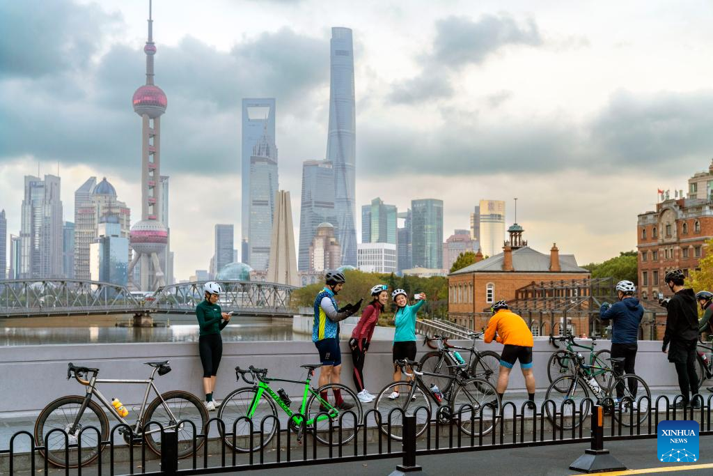 Cyclists take photos by the Suzhou Creek in east China's Shanghai, Nov. 4, 2022. The fifth China International Import Expo (CIIE) is held in Shanghai from Nov. 5 to 10. (Photo by Fan Yeqin/Xinhua)