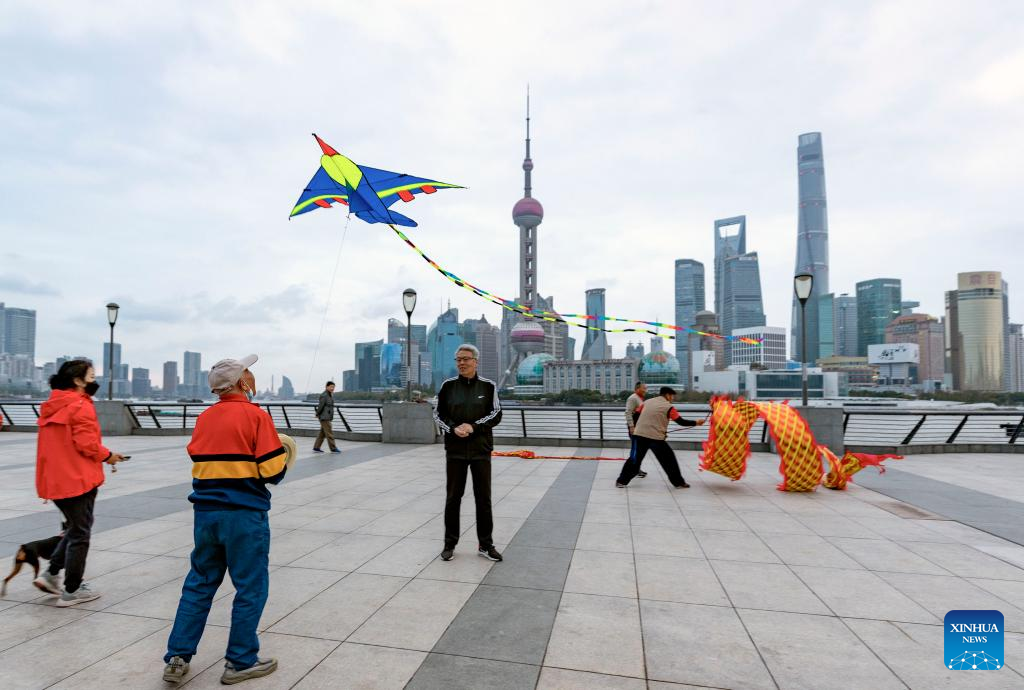 Residents enjoy outdoor activities at the Bund in east China's Shanghai, Nov. 4, 2022. The fifth China International Import Expo (CIIE) is held in Shanghai from Nov. 5 to 10. (Photo by He Zhongming/Xinhua)