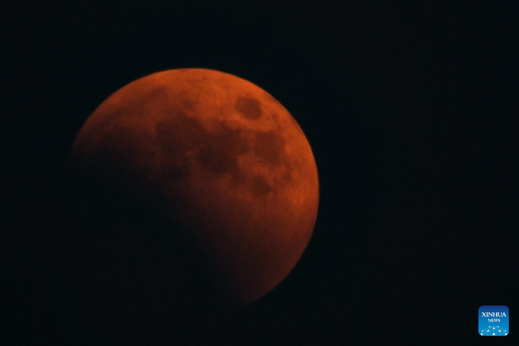 The moon is seen during a total lunar eclipse in Beijing, capital of China, Nov. 8, 2022. (Xinhua/Fei Maohua)