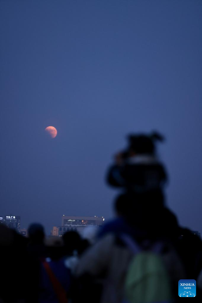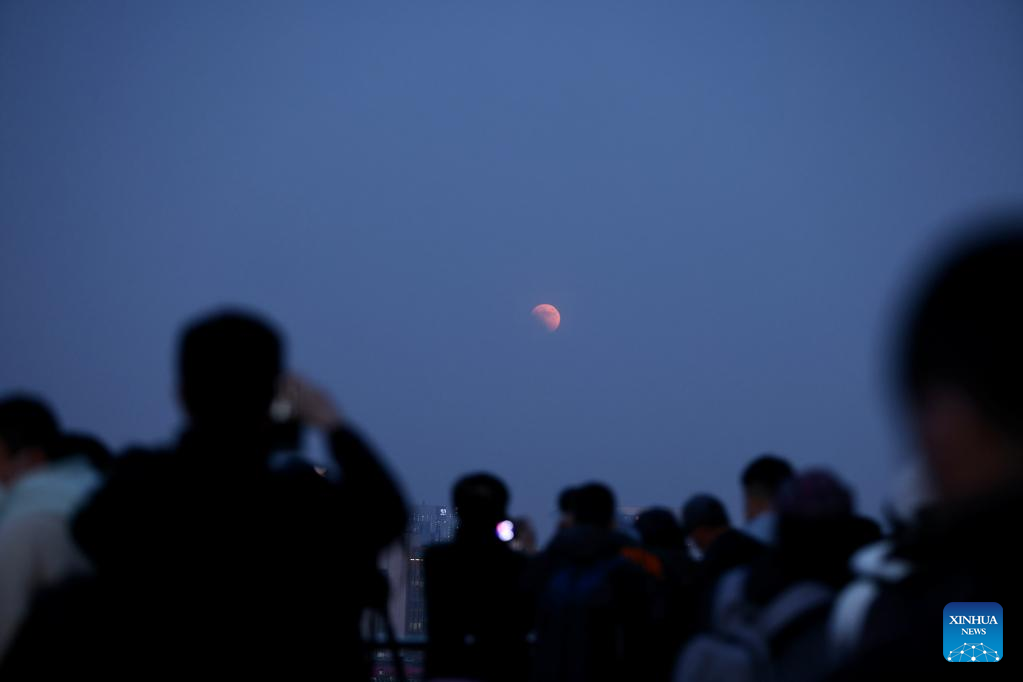 People watch the total lunar eclipse at Jingshan Park in Beijing, capital of China, Nov. 8, 2022. (Xinhua/Hao Zhao)