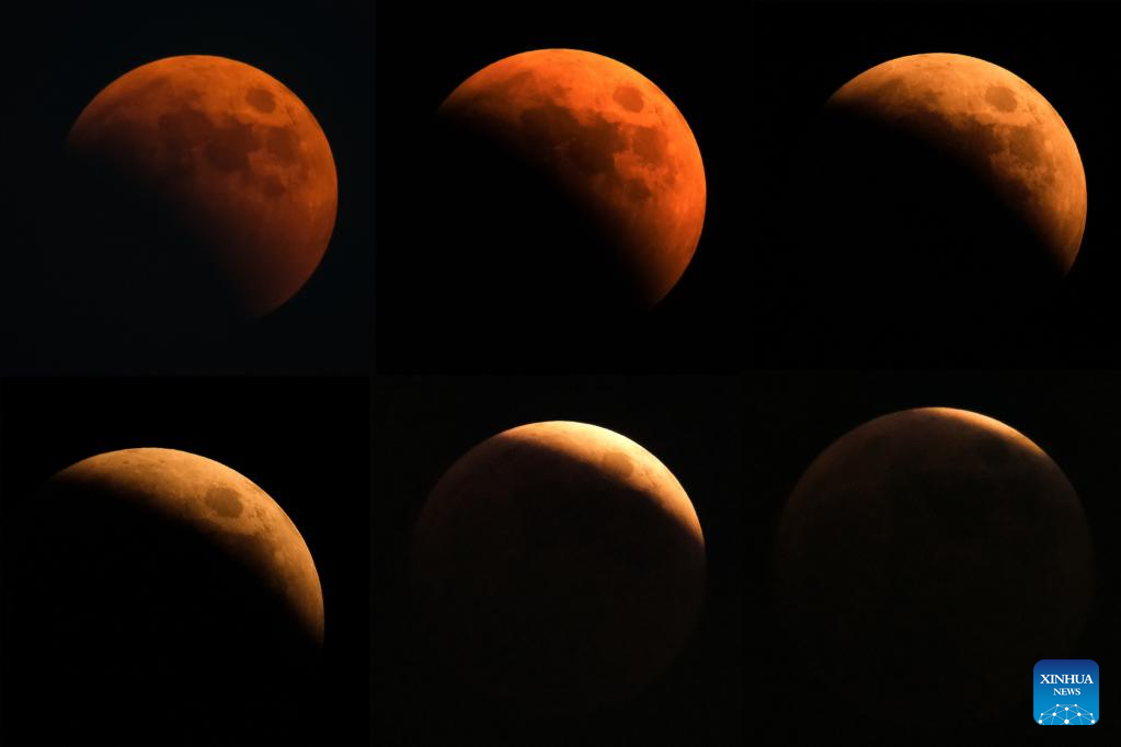 This combo photo shows different stages of the moon during a total lunar eclipse in Beijing, capital of China, Nov. 8, 2022. (Xinhua/Zhang Cheng)