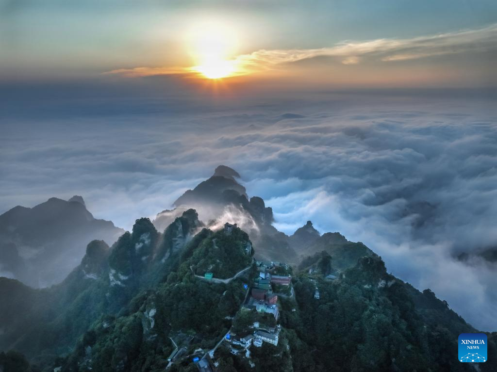 This photo taken on July 26, 2022 shows Mount Wudang shrouded in clouds at sunrise in central China's Hubei Province.