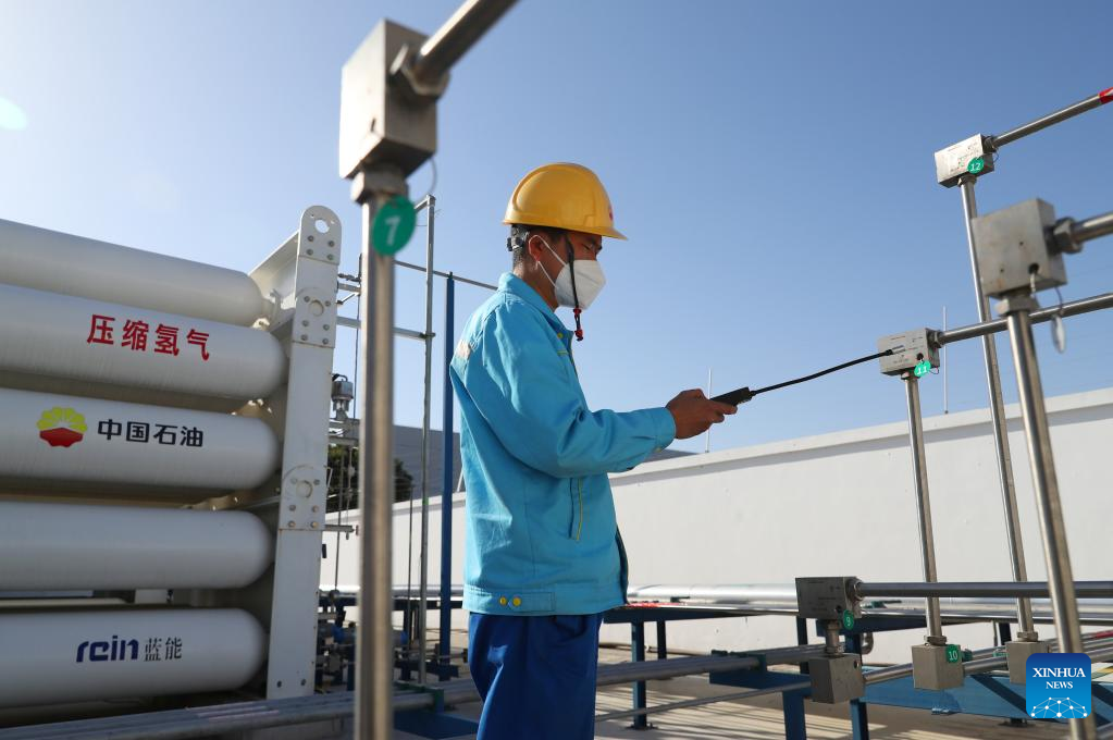 A staff member performs safety check at a hydrogen refueling station in Lingang new area of Pudong New Area in east China's Shanghai, Dec. 15, 2022. As a demonstrative zone for commercial operation of hydrogen fuel cell-powered vehicles in Shanghai, Lingang new area has walked an extra mile since early 2022 to put more hydrogen fuel cell-powered public buses into practical service and to date 66 units of its kind are now running on the roads there. Another 52 units have already started zero-payload trial operation and are expected to kick off their official service before the end of this year. (Xinhua/Fang Zhe)
