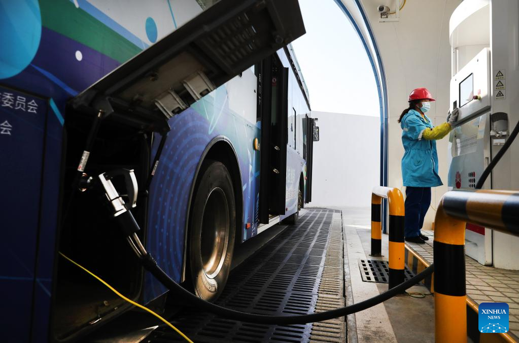 A staff member refuels a public bus at a hydrogen refueling station in Lingang new area of Pudong New Area in east China's Shanghai, Dec. 15, 2022. As a demonstrative zone for commercial operation of hydrogen fuel cell-powered vehicles in Shanghai, Lingang new area has walked an extra mile since early 2022 to put more hydrogen fuel cell-powered public buses into practical service and to date 66 units of its kind are now running on the roads there. Another 52 units have already started zero-payload trial operation and are expected to kick off their official service before the end of this year. (Xinhua/Fang Zhe)
