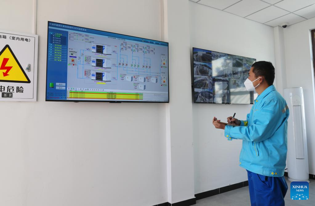 A staff member records equipment operation status at a hydrogen refueling station in Lingang new area of Pudong New Area in east China's Shanghai, Dec. 15, 2022. As a demonstrative zone for commercial operation of hydrogen fuel cell-powered vehicles in Shanghai, Lingang new area has walked an extra mile since early 2022 to put more hydrogen fuel cell-powered public buses into practical service and to date 66 units of its kind are now running on the roads there. Another 52 units have already started zero-payload trial operation and are expected to kick off their official service before the end of this year. (Xinhua/Fang Zhe)