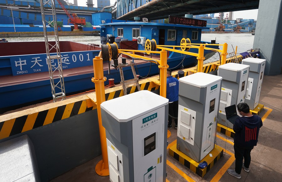 A worker prepares charging piles for the electric cargo ship "Zhongtiandianyun 001" in Changzhou, east China's Jiangsu Province, May 7, 2020. (Xinhua/Ji Chunpeng)