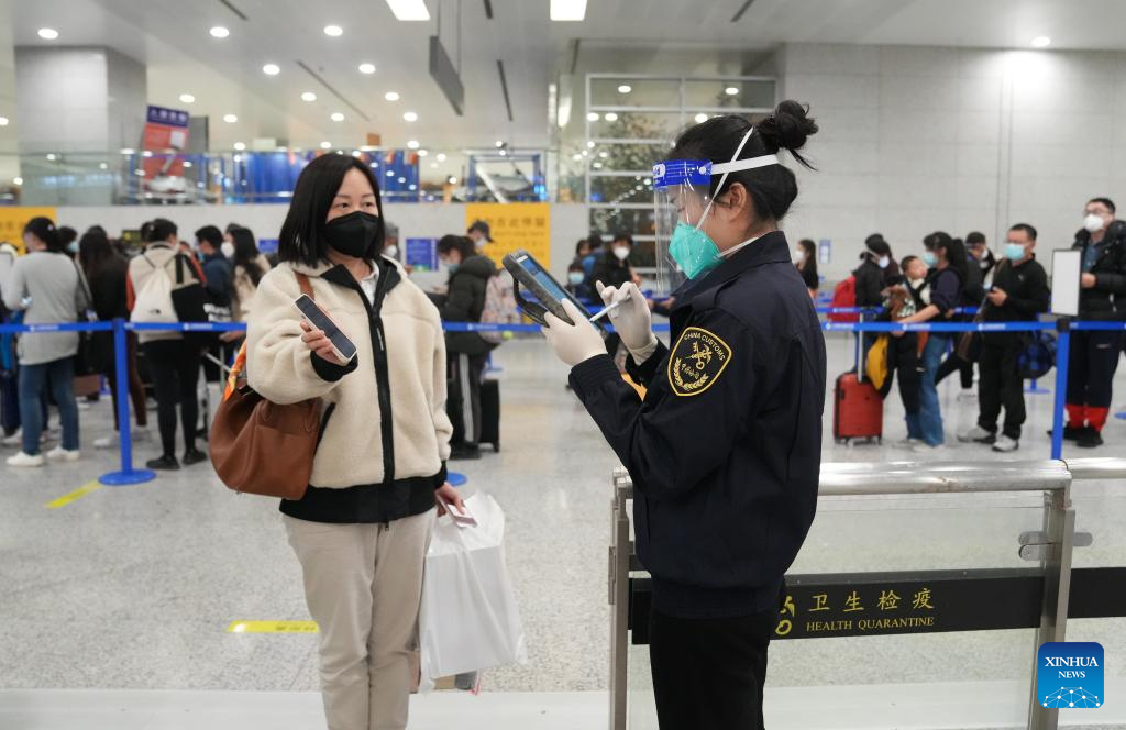 A staff member of the customs of Shanghai Pudong International Airport checks the information of an inbound passenger in east China's Shanghai, Jan. 8, 2023. From Sunday, China starts managing COVID-19 with measures designed for combating Class B infectious diseases, instead of Class A infectious diseases. (Xinhua/Ding Ting)