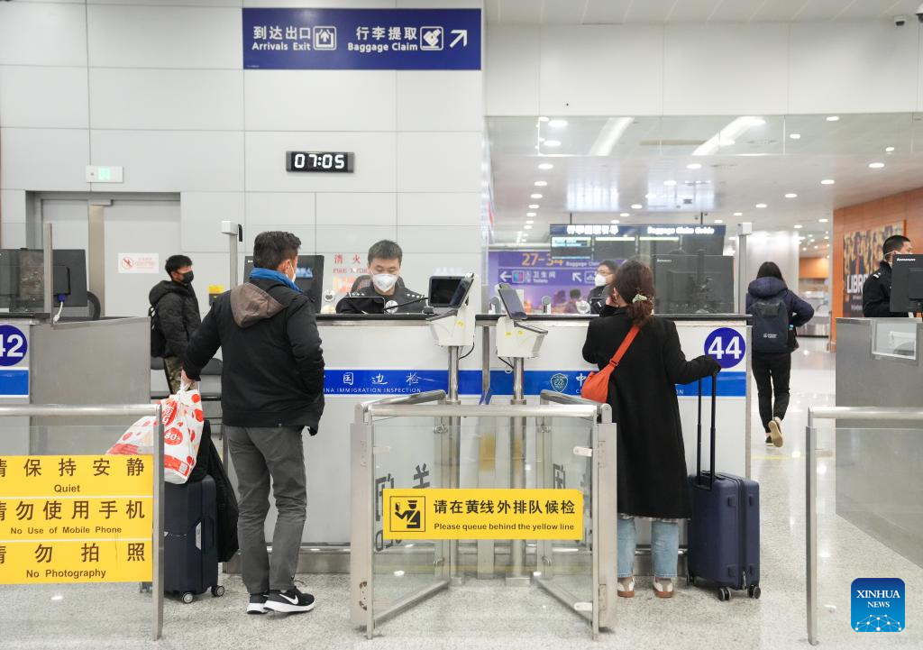 Passengers go through entry procedures at Shanghai Pudong International Airport in east China's Shanghai, Jan. 8, 2023. From Sunday, China starts managing COVID-19 with measures designed for combating Class B infectious diseases, instead of Class A infectious diseases. (Xinhua/Ding Ting)
