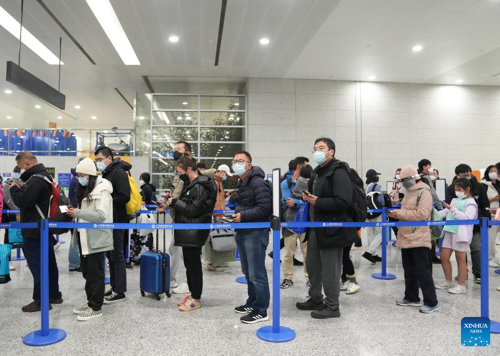 Passengers queue up to go through entry procedures at Shanghai Pudong International Airport in east China's Shanghai, Jan. 8, 2023. From Sunday, China starts managing COVID-19 with measures designed for combating Class B infectious diseases, instead of Class A infectious diseases. (Xinhua/Ding Ting)