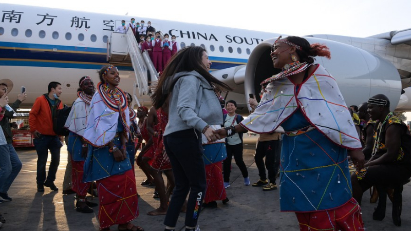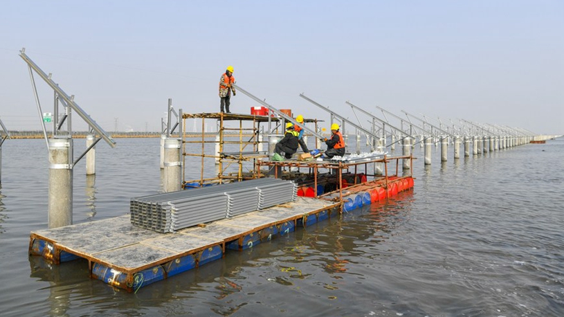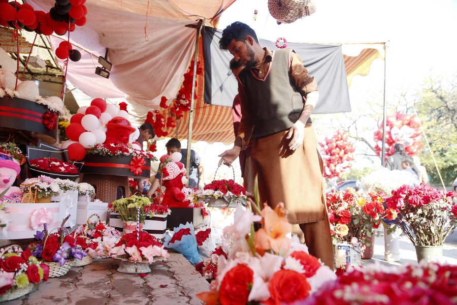 A shopkeeper arranges flowers at a flower shop on the eve of Valentine's Day in Islamabad, capital of Pakistan on Feb. 13, 2023. (Xinhua/Ahmad Kamal)■