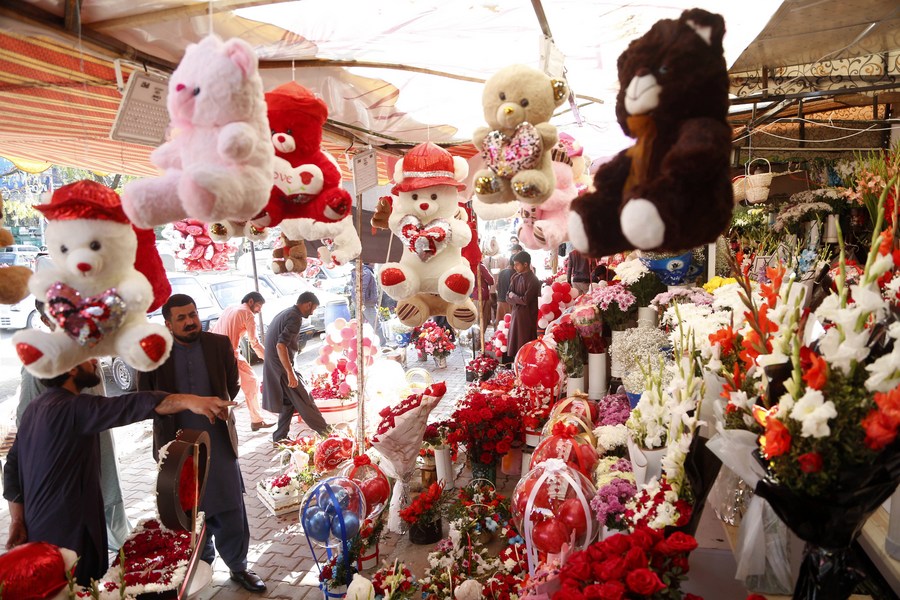 People visit a shop to buy gifts on the eve of Valentine's Day in Islamabad, capital of Pakistan on Feb. 13, 2023. (Xinhua/Ahmad Kamal)