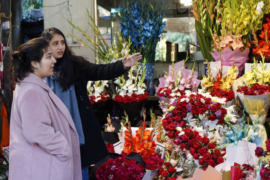 People buy flowers at a flower shop on the eve of Valentine's Day in Islamabad, capital of Pakistan on Feb. 13, 2023. (Xinhua/Ahmad Kamal)