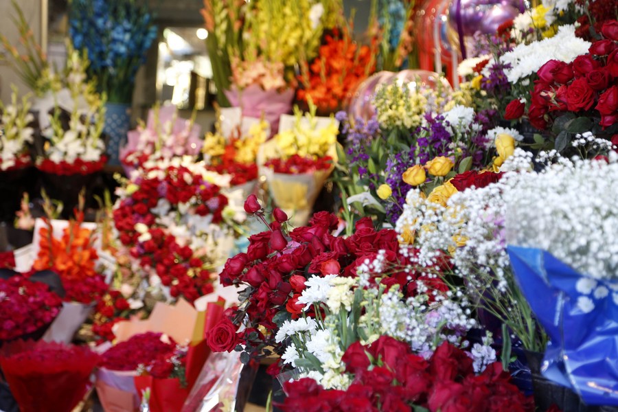 Flowers are seen at a flower shop on the eve of Valentine's Day in Islamabad, capital of Pakistan on Feb. 13, 2023. (Xinhua/Ahmad Kamal)