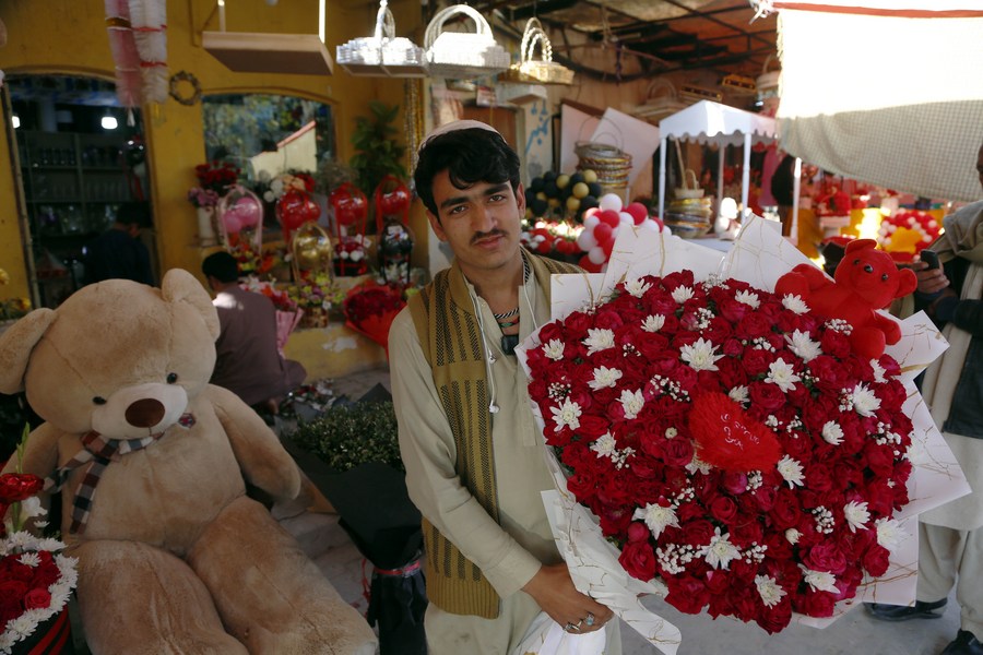 A shopkeeper poses with a flower bouquet at a flower shop on the eve of Valentine's Day in Islamabad, capital of Pakistan on Feb. 13, 2023. (Xinhua/Ahmad Kamal)