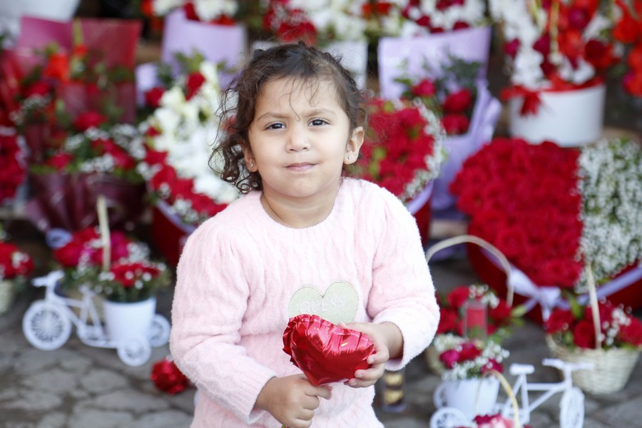 A girl is pictured in front of a flower shop on the eve of Valentine's Day in Islamabad, capital of Pakistan on Feb. 13, 2023. (Xinhua/Ahmad Kamal)