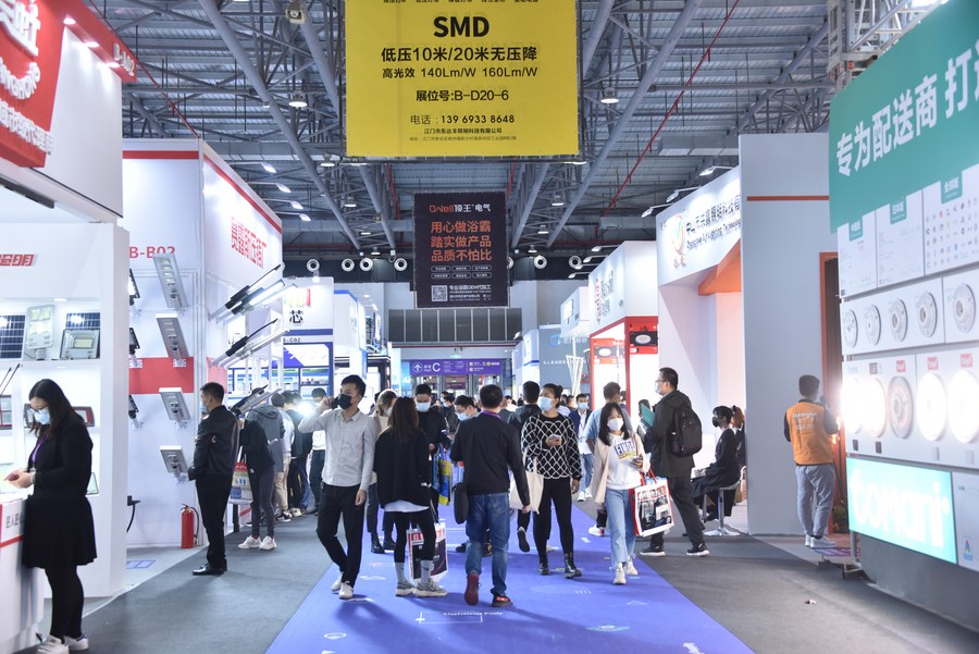 People visit the 27th China (Guzhen) International Lighting Fair (GILF) in Zhongshan, south China's Guangdong Province, Oct. 22, 2021. (Xinhua)