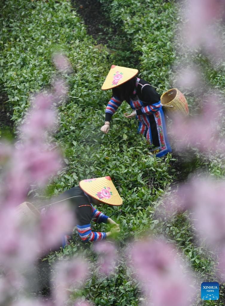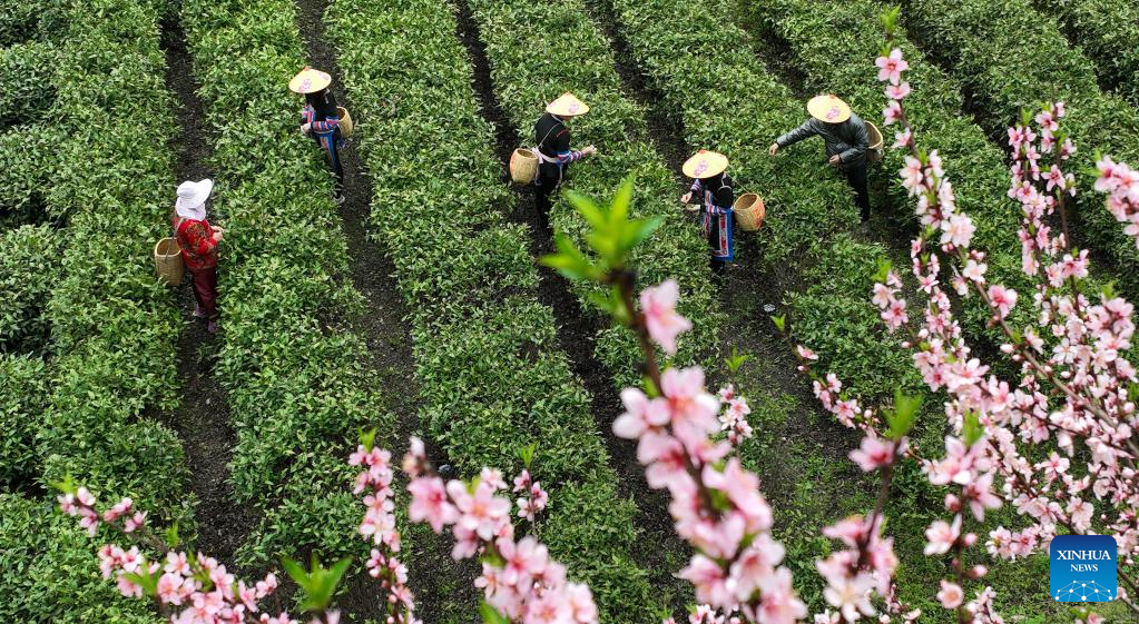 Villagers pick tea leaves in Tashan Town of Changning, central China's Hunan Province, March 20, 2023. Tea farmers in Tashan are busy picking and processing tea leaves in harvest season. The local economy is boosted as tea planting industry in Tashan is integrated with tourism. (Xinhua/Zhao Zhongzhi)