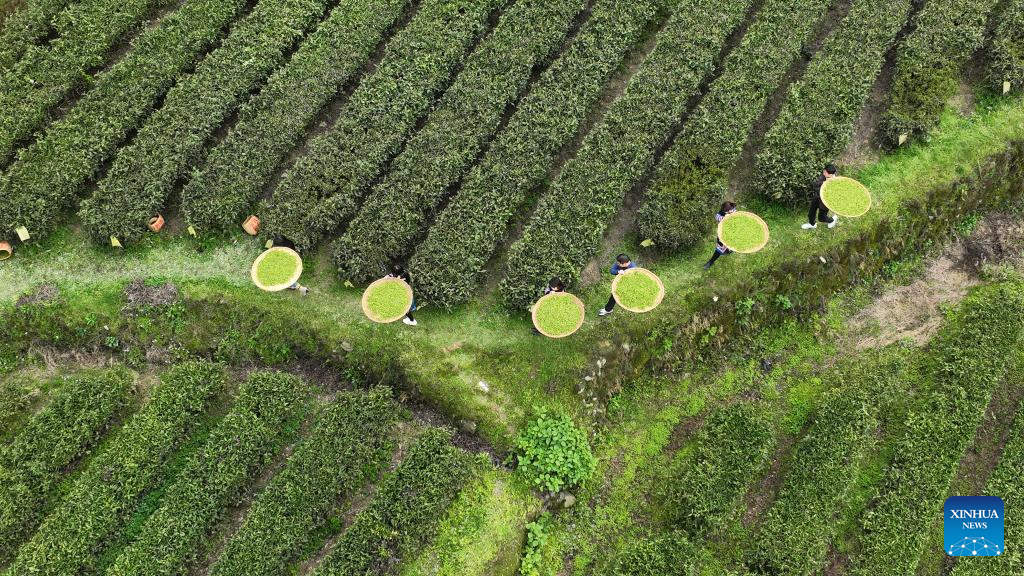 This aerial photo taken on March 20, 2023 shows farmers picking tea leaves in Tashan Town of Changning, central China's Hunan Province. Tea farmers in Tashan are busy picking and processing tea leaves in harvest season. The local economy is boosted as tea planting industry in Tashan is integrated with tourism. (Xinhua/Zhao Zhongzhi)