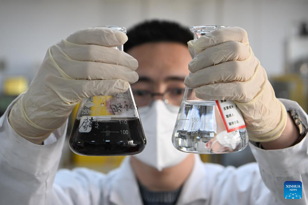 A researcher displays industrial wastewater and processed recycled water at the National Research Center of Industrial Water Treatment Engineering and Technology in north China's Tianjin, March 22, 2023. The National Research Center of Industrial Water Treatment Engineering and Technology at China National Offshore Oil Corporation Tianjin Chemical Research and Design Institute Co., Ltd. in Tianjin endeavors to promote scientific research and tackle key problems in industrial water treatment technology.