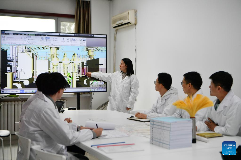 Researchers attend a discussion meeting at the National Research Center of Industrial Water Treatment Engineering and Technology in north China's Tianjin, March 20, 2023. The National Research Center of Industrial Water Treatment Engineering and Technology at China National Offshore Oil Corporation Tianjin Chemical Research and Design Institute Co., Ltd. in Tianjin endeavors to promote scientific research and tackle key problems in industrial water treatment technology.