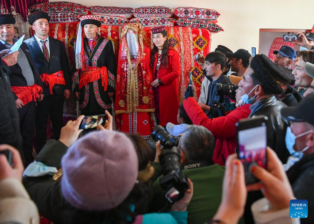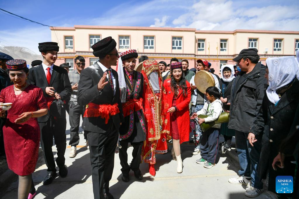 The new couple (3rd and 4th L) receive blessings at their wedding ceremony, while relatives and friends, villagers and tourists witness the happy moment in Taxkorgan Tajik Autonomous County, northwest China's Xinjiang Uygur Autonomous Region, March 19, 2023. In Taxkorgan Tajik Autonomous County, many young men and women prefer to get married in the spring season.