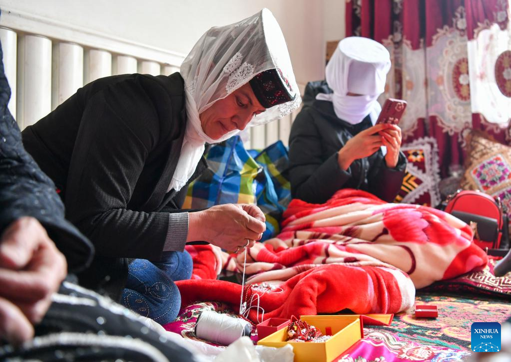 Elders of Gulihan Jrbli's family prepare her accessories for the wedding ceremony in Taxkorgan Tajik Autonomous County, northwest China's Xinjiang Uygur Autonomous Region, March 18, 2023. In Taxkorgan Tajik Autonomous County, many young men and women prefer to get married in the spring season.